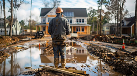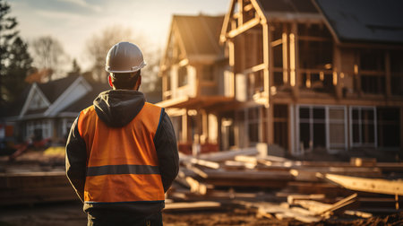 Construction worker standing in front of a new house on a construction site