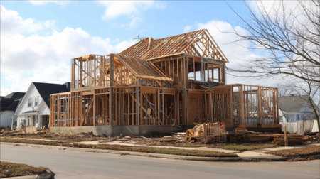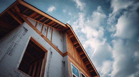 A newly constructed wooden house frame stands tall against a cloudy sky, showcasing the progress of residential construction in a suburban neighborhood.