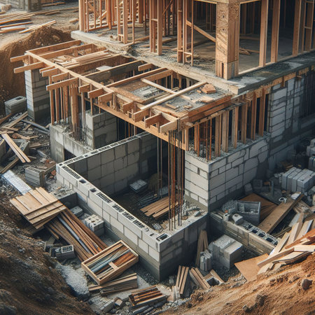 Building site of a residential house under construction, showcasing unfinished walls and roofing