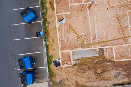 Aerial view of apartment framing of a new house under construction with forklift stacker wooden boards the construction trash dumpsters