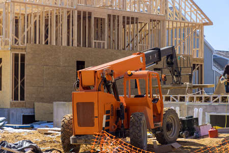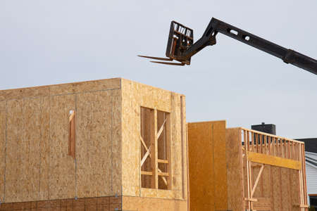 forklift at a construction site of a plywood house wood new frame work outdoor telescopic wall