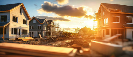 Wide shot of a new housing development under construction at sunset