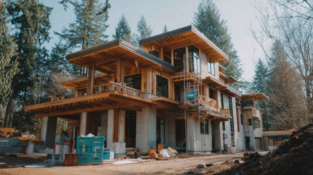 This image showcases a modern luxury house under construction, blending innovative design with natural surroundings, highlighting craftsmanship and urban living.