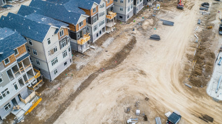 A detailed aerial view showcasing a residential housing development's construction stage with framed houses, scattered materials, and an expanse of bare earth in an urban area.