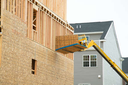 Wood building frame on new residential in under construction a boom truck forklift work