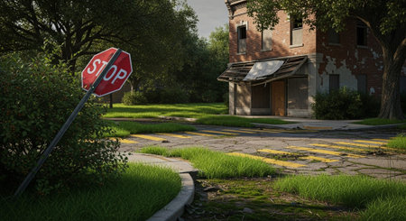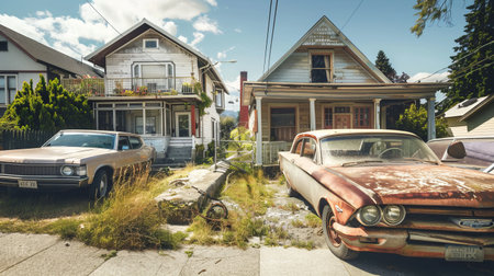 An evocative scene of abandoned houses lining a quiet street, capturing the golden hour light. The peaceful atmosphere evokes nostalgia and natural beauty.