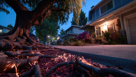 Low-angle close-up view of tree roots extending across a paved walkway. Sparks are visible around the roots and branches. Residential houses are in the background. The scene is bathed in the soft light of dusk.