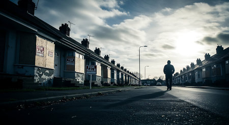 An inviting sunset casts a warm glow over a quiet suburban street. Rows of houses line the road, framed by autumnal trees. The image showcases a tranquil environment, bathed in the soft light of dusk. Suitable for depicting residential settings or illustrating seasonal transitions for various commercial purposes.