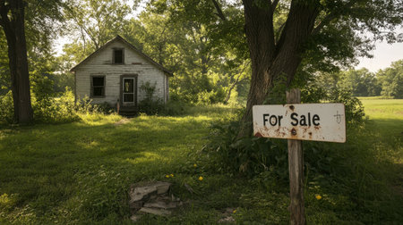 A captivating image of an abandoned house for sale, nestled among vibrant greenery, inviting exploration and potential renovation for dreamers seeking rural tranquility.