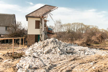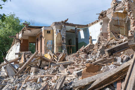 Garbage after the demolition of the building. Broken walls, windows. The process of demolishing an old building. Demolition of dilapidated housing for new development
