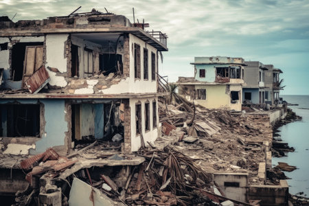 Collapsed Walls of Houses and Damaged Roofs Due to the Strongest Storm and Hurricane extreme closeup. Generative AI
