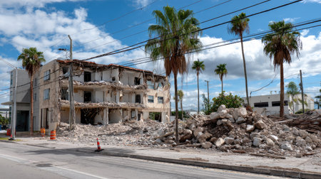 This image captures a scene of urban decay featuring palm trees amid the rubble of demolished buildings, showcasing nature