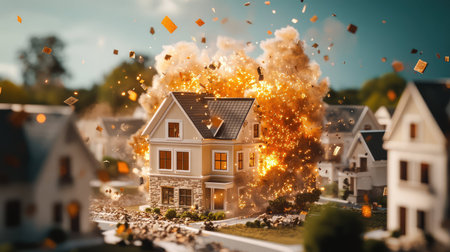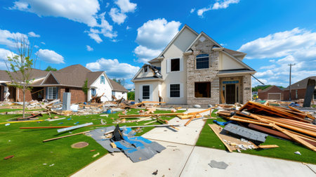 A suburban neighborhood shows the aftermath of a severe storm, featuring a damaged home and piles of debris. The scene highlights the chaos and destruction of nature's forces.