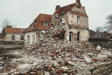 Decay showing pile of rubble and debris from a destroyed building under a cloudy sky keywords: rubble, debris,...