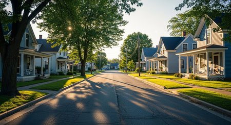 A quiet suburban street with classic houses and manicured green lawns is illuminated by the warm, golden light of the late afternoon sun.