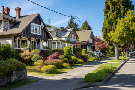 A sunny suburban avenue with houses arranged in symmetry, shaded by leafy trees against a serene sky.