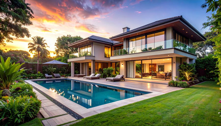 An elegant modern home with a bright blue swimming pool and colorful garden is set against a dramatic sunset sky.
