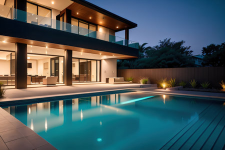 A tranquil modern pool scene at sunset invites relaxation, showcasing serene water reflections and lush greenery surrounding a stylish home, perfect for leisure moments.