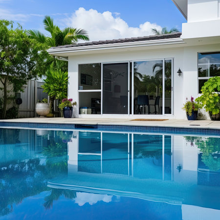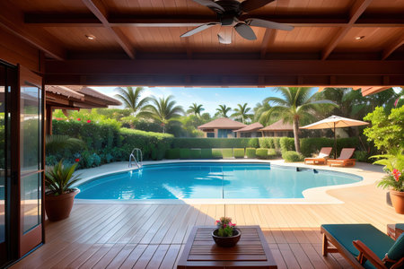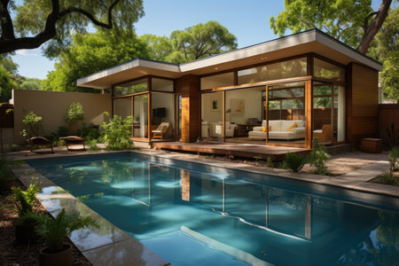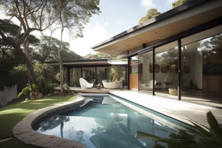 sloped roof, windows and doors with views of the garden and pool, created with generative ai