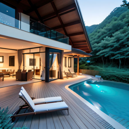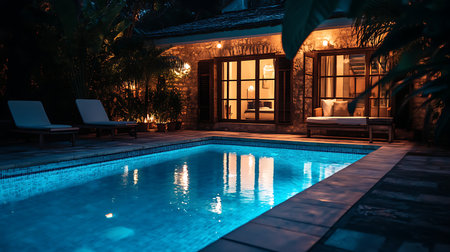 An inviting pool area at a luxurious villa invites relaxation and tranquility in a serene evening setting.