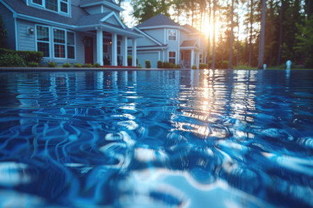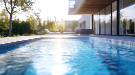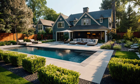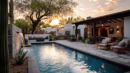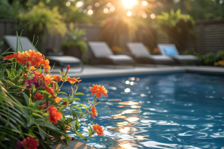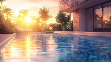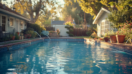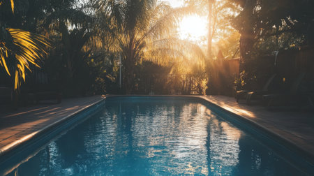 Tranquil Backyard Scene with Sparkling Swimming Pool at Sunset, Serene Residential Outdoor Setting with Warm Light AI Generative