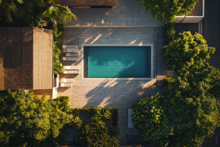 This captivating aerial view showcases a serene swimming pool with bright blue water reflecting sunlight, inviting relaxation and tranquility.