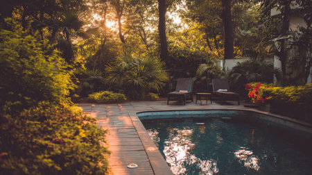 A tranquil poolside scene with loungers, foliage, and warm sunset lighting.