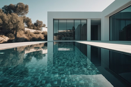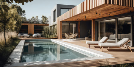 Design house - modern villa with open plan living and private bedroom wing. Large terrace with privacy and, swimming pool. Generative AI.