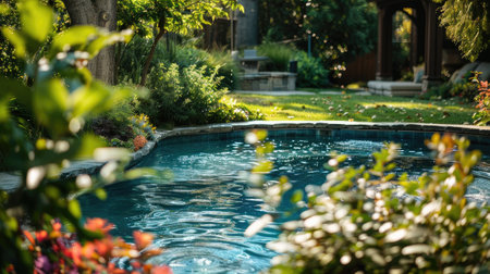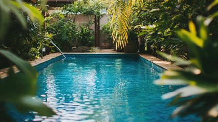 A tranquil blue swimming pool nestled among lush greenery, inviting relaxation and serenity. Perfect for a refreshing escape into nature's beauty.