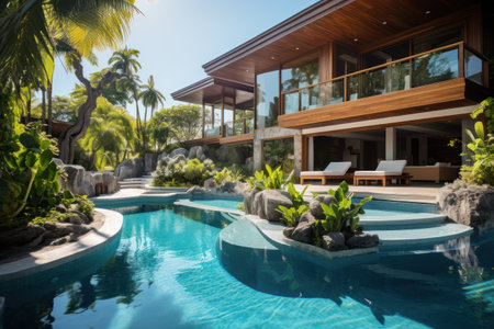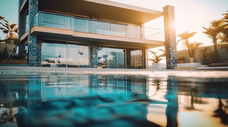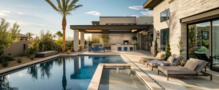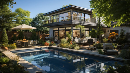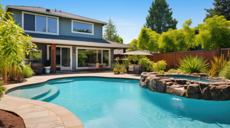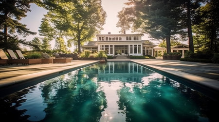 The outdoor swimming pool in backyard of the luxury mansion. Generative AI AIG27.
