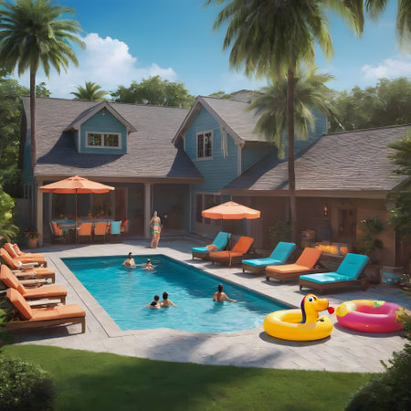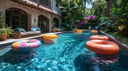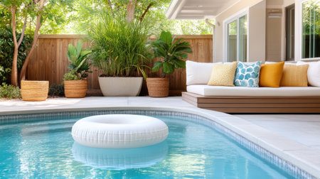 summer pool oasis, ideal summer relaxation spot for the family: backyard pool with clear water and colorful floaties