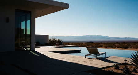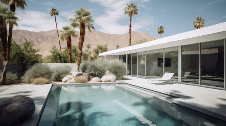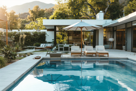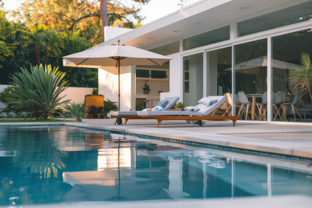 Lounge chairs near the pool, umbrella, white midcentury modern home in the background. AI generative