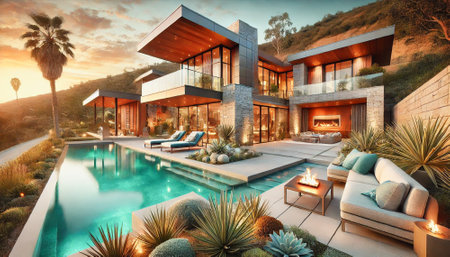 Ultra-modern hillside villa with a luxurious pool and fire pit lounge. AI-generated