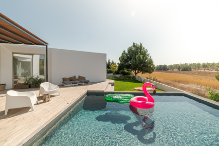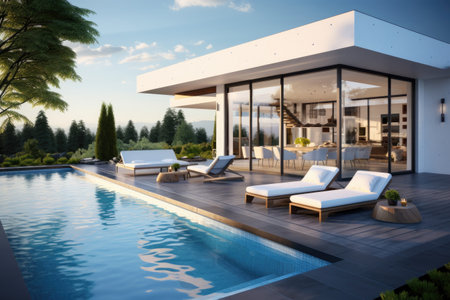 Elegant modern poolside villa. Luxury home with swimming pool in modern style.