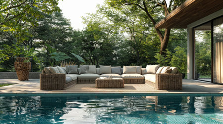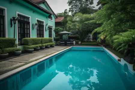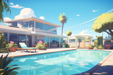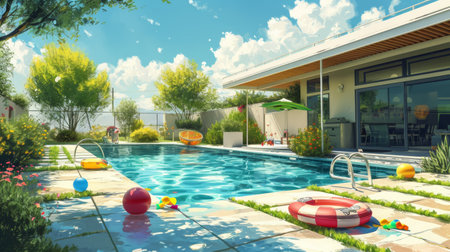 Courtyard pool of a suburban house, family-friendly design, pool toys, green lawn, detailed and inviting illustration --ar 16:9 --v 6 Job ID: d6b52637-d8ac-4e9e-8ea2-ff973533fb8b Generative AI