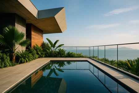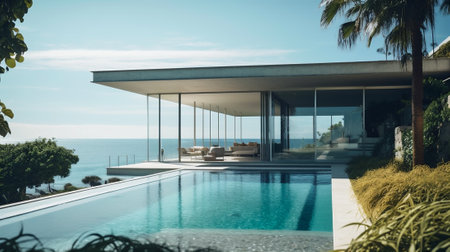 Luxury European beach villa with a private pool and stunning sea views, offering a relaxing setting with copy space.