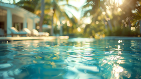 Experience a tranquil morning scene by a pool, with sunlight filtering through palm trees and reflecting on the calm water, creating a serene oasis for relaxation.