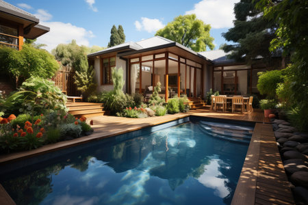 Swimming pool and decking in garden of luxury home, bright color. Generative Ai