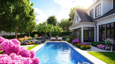 Experience a serene backyard oasis featuring a sparkling blue pool surrounded by colorful flowers and lush greenery, inviting relaxation and wellbeing.