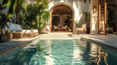 A serene courtyard features a clear pool surrounded by tropical plants and elegant outdoor furniture. Sunlight bathes the area, creating a tranquil atmosphere for relaxation.