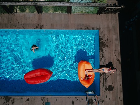 top view of an inflatable mattress inflating in a sunlit pool. Invite viewers to embrace summer fun and relaxation with this vibrant outdoor scene
