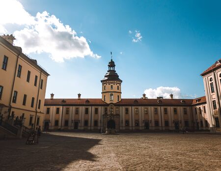 Nesvizh Castle Courtyard with Picturesque Blue Sky Background at sunny summer day.