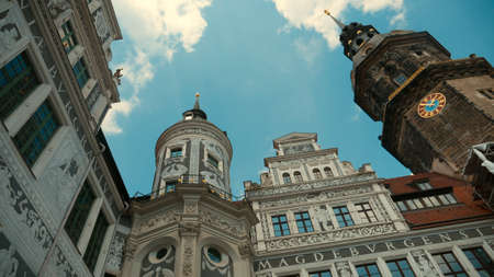 DRESDEN, GERMANY - MAY 2, 2018. Hofkirche church and Hausmannsturm tower in city centre