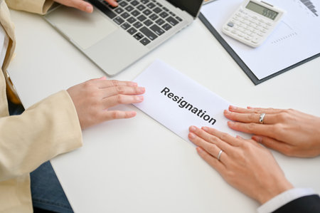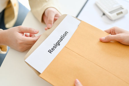 Close up submitting a resignation letter to the boss