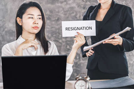 Concept resign depress and resignation., change of job, unemployment, Resign concept. Businesswoman sending a letter of resignation to the boss but the boss didn't want to resign.