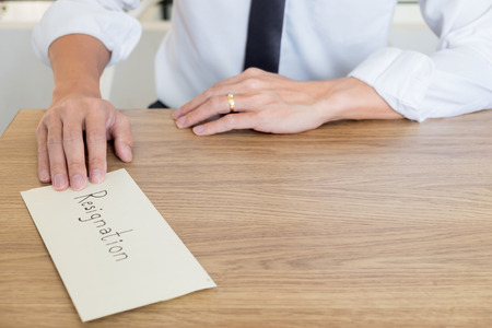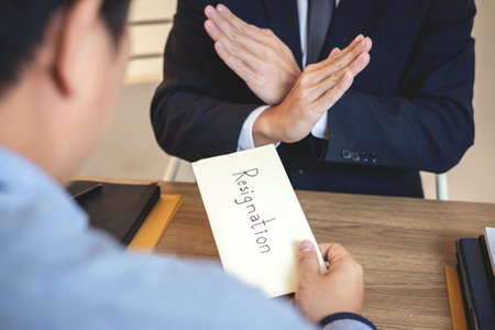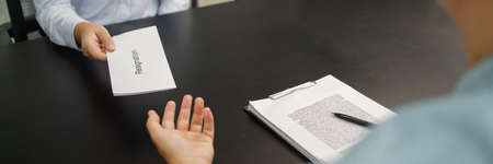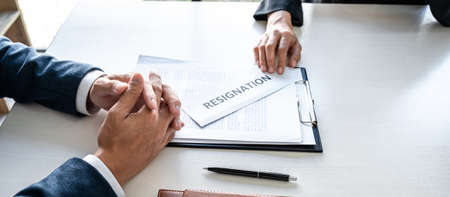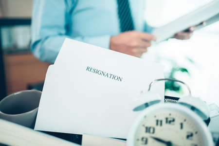 Businessman sending resignation letter to the executive employer boss on desk in order to resign dismiss contract, job placement and vacancies concept
