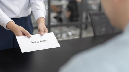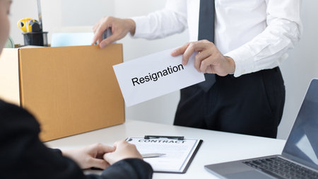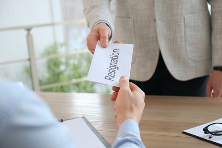 Office worker holding paper with text RESIGNATION at table