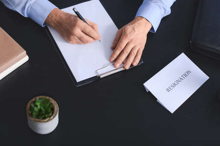 Paper with text RESIGNATION on table of office worker