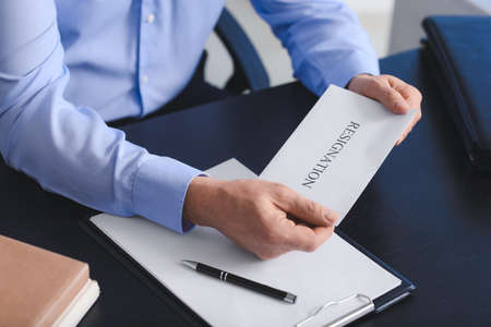 Man holding paper with text RESIGNATION at table in office
