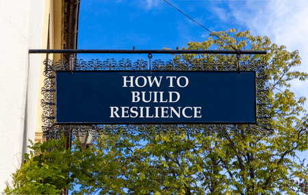 How to build resilience symbol. Concept words How to build resilience on black beautiful road sign. Beautiful blue sky trees background. Business how to build resilience concept. Copy space.